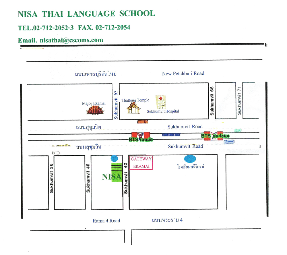 Nisa is currently Located at 8/3-5, 2nd & 3rd Floor of Y.M.C.A., Sukhumvit Soi 42, Sukhumvit Road, Klongtan, Klongtoey, Bangkok. The School is near the shopping and entertainment district of Sukhumvit, and is easily accessible through the subway system and BTS Ekamai.